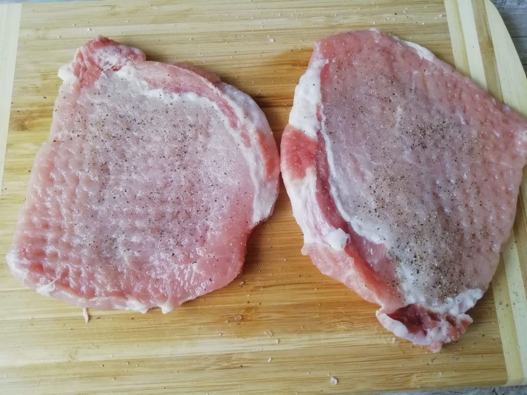 Mięso rozbić tłuczkiem. Posyp solą i pieprzem, polej olejem, rozetrzyj dłonią i ułóż jeden na drugim.