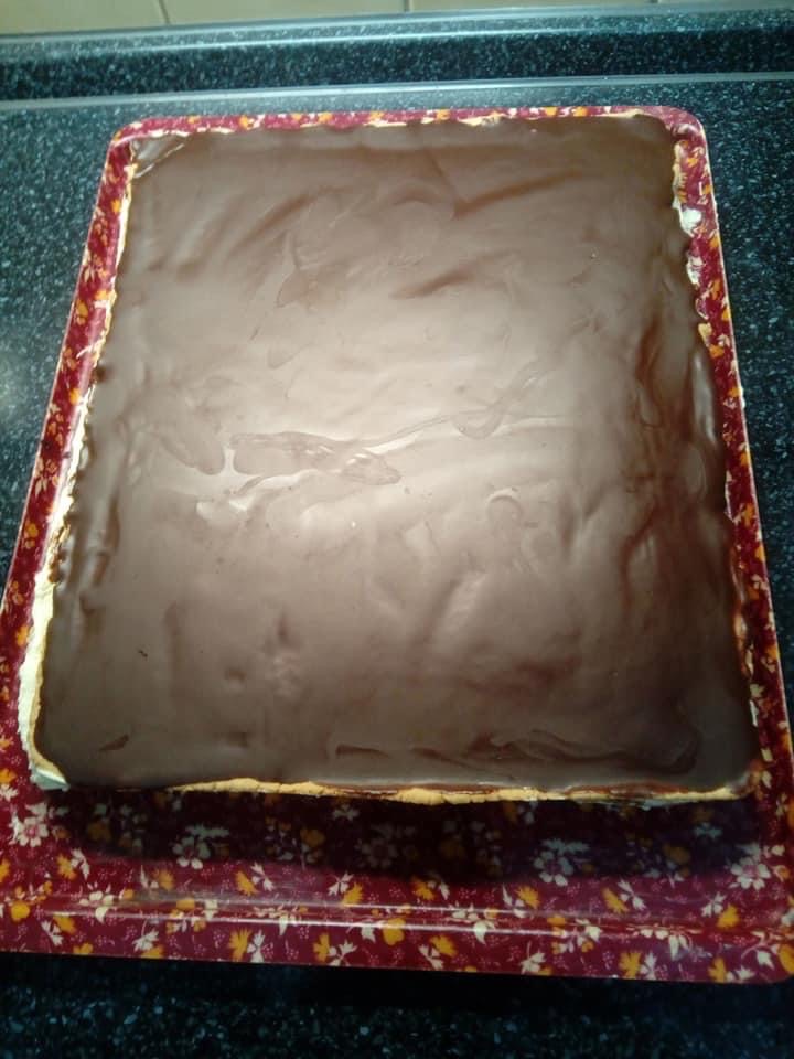 Gotowe ciasto polej polewą czekoladową. Dla wyższego deseru, każdy arkusz ciasta możesz podzielić na pół i ułożyć jeden na drugim. Smacznego życzymy!