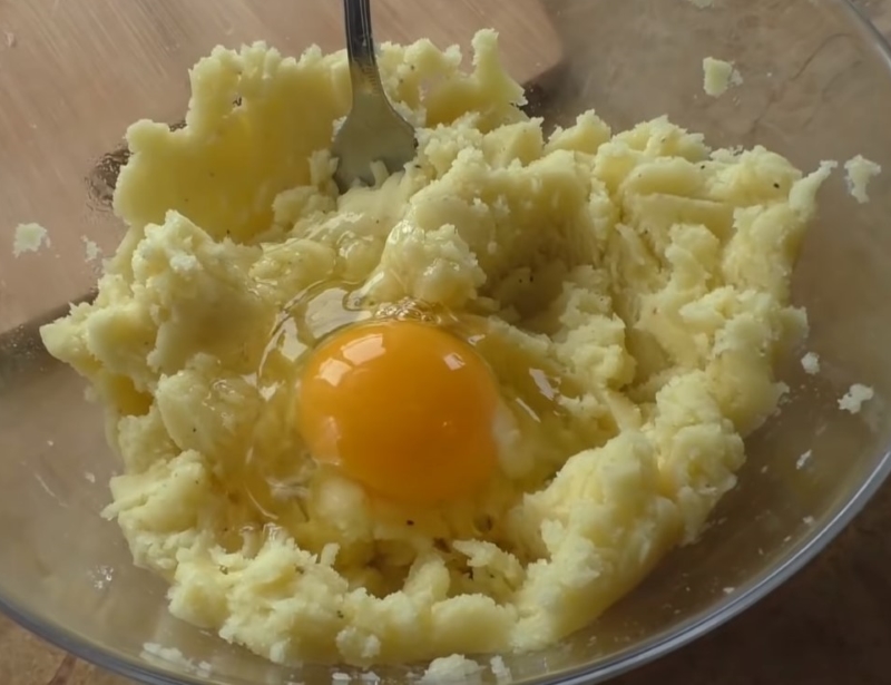 2. Ugotowane wcześniej ziemniaki, ugnieć z masłem na gładkie puree, następnie dodaj sól, pieprz oraz jajko. Masę ziemniaczaną dobrze wymieszaj i uformuj z niej kulki. W środek każdej ziemniaczanej kulki, włóż kosteczkę, pokrojonego wcześniej sera. Dobrze sklej ze sobą brzegi, aby ser nie wypłynął.