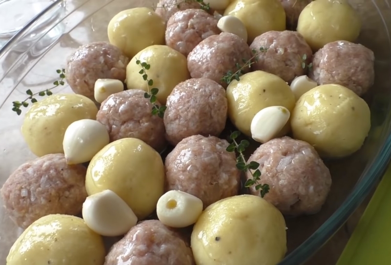 3. Do naczynia żaroodpornego wysmarowanego masłem, przełóż kulki mięsne i kulki ziemniaczane. Wszystkie kulki z wierzchu, posmaruj olejem.