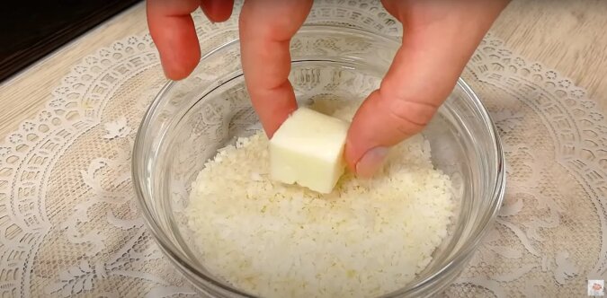 Każdą kostkę wkładaj do miseczki z wiórkami kokosowymi (możesz użyć cukru pudru lub kakao w proszku).