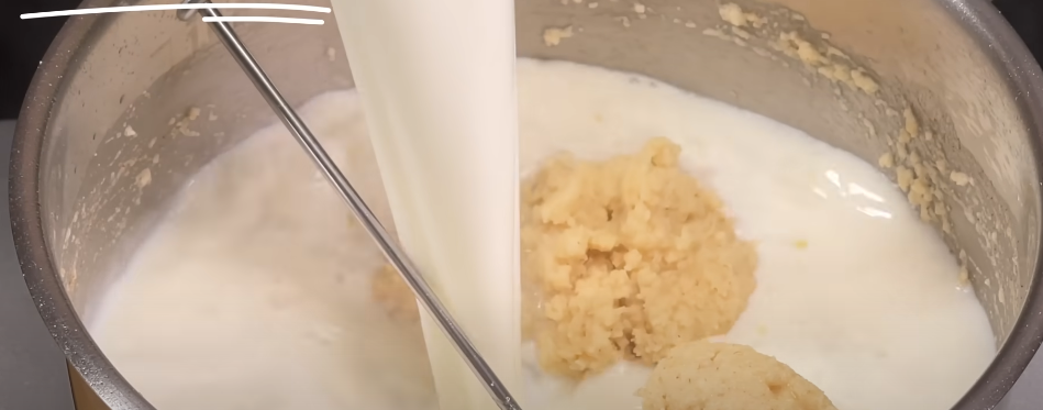 3. Mleko: Powoli wlej 500 ml mleka, ciągle mieszając, aby uniknąć grudek. Gotuj, aż sos zgęstnieje.