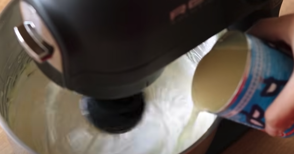 Do miski miksera wlać dobrze schłodzoną śmietankę kremówkę. Zacznij ubijać śmietanę na niskich obrotach miksera, a następnie przełącz na wyższe obroty. Gdy tylko zaczną tworzyć się wyraźne ślady z miksera, zacznij stopniowo wlewać skondensowane mleko cienkim strumieniem, ciągle mieszając.