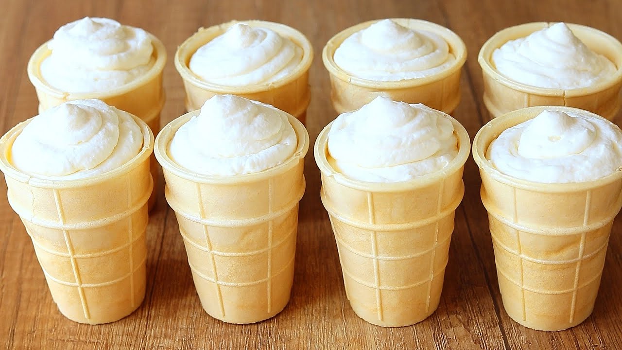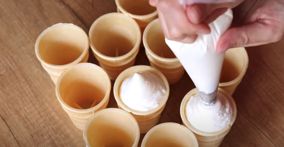 Przenieś masę do worka z okrągłą końcówką dla wygody. Użyj rożków waflowych, napełniając je kremem. Możesz również użyć dowolnych pojemników lub wziąć jeden duży pojemnik, a po zamrożeniu nabierać lody łyżką. Włóż lody do zamrażarki na 5-6 godzin.