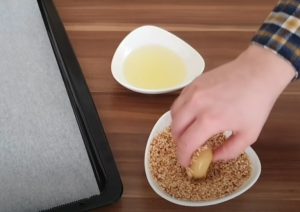 Blachę wyłożyć papierem do pieczenia i posypać posiekanymi orzechami laskowymi. Zanurz połówkę każdej kulki w białku z odłożonej wcześniej miski. Następnie zanurz go w orzechach, aby przykleiły się do kulki i umieść ją na blasze do pieczenia.