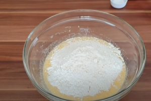 Włóż jedno jajko i żółtko z drugiego jajka do miski (białko użyjesz później). Ubijaj, aż się pieni. Następnie dodać olej i ponownie ubić. Na koniec posyp 180 gramów mąki, proszkiem do pieczenia i wanilią. Jeśli go nie masz, użyj wystarczającej ilości cukru waniliowego. Zmiksuj gładkie ciasto.