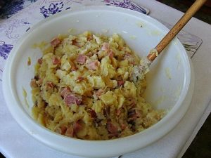 W garnku zagotować wodę z łyżeczką soli. Wrzuć do niego mały kawałek przygotowanego ciasta i pozwól mu się zagotować. Jeśli się trzyma, możesz iść, jeśli nie, dodaj trochę więcej mąki. Rozłóż ciasto na zwilżonej desce do krojenia i nożem odetnij małe kawałki i wrzuć je do wrzącej wody.
