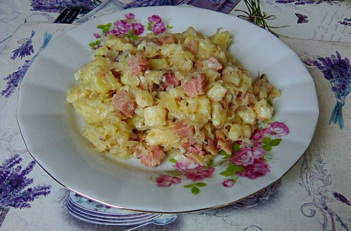 Gotuj gnocchi w wodzie przez około 10 minut, od czasu do czasu mieszaj, a po zagotowaniu spróbuj, czy są wystarczająco ugotowane. W międzyczasie przygotować kapustę kiszoną. Cebulę podsmażamy na smalcu, wrzucamy na nią kapustę kiszoną (w razie potrzeby opłukujemy) i doprawiamy solą, kminkiem i ewentualnie octem jeśli nie jest wystarczająco kwaśna. Gotuj, aż odparuje z niego woda, ale nie powinien być zbyt miękki.
