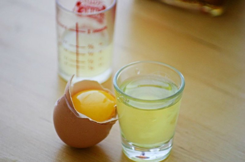 Weź białko z jednego jaja i je ubij. Nałóż je na wcześniej oczyszczone powieki, możesz użyć wacika. Poświęć szczególną uwagę miejscu pod oczami oraz nad okiem aż do linii brwi. Zmocz waciki ciepłą wodą i połóż je na powiekach. Najlepiej przyjąć pozycję leżącą i się rozluźnić.