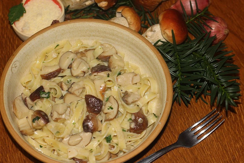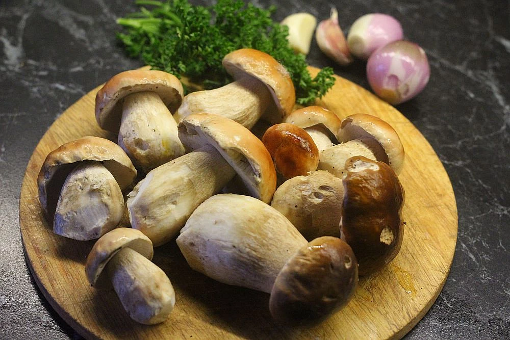 Szalotkę i czosnek obrać i drobno posiekać. Dodać oba do borowików, krótko podsmażyć, zalać winem i zagotować. Następnie bulionem zalać grzyby, doprawić solą i pieprzem, przykryć pokrywką i dusić około 10 minut.