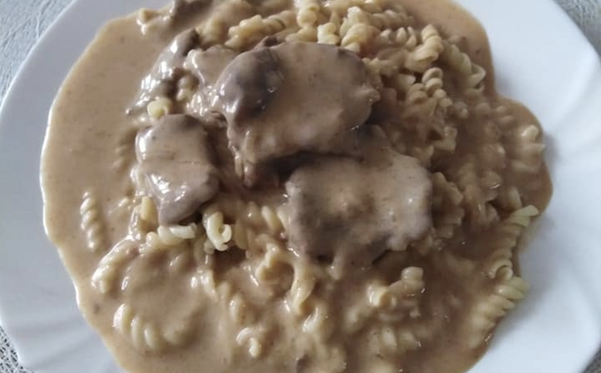 Dodać mąkę, śmietankę po minucie, doprawić i wszystko dobrze wymieszać, dodać podsmażone piersi i smażyć kolejne 5 minut na małym ogniu. Podawać z ryżem lub makaronem.