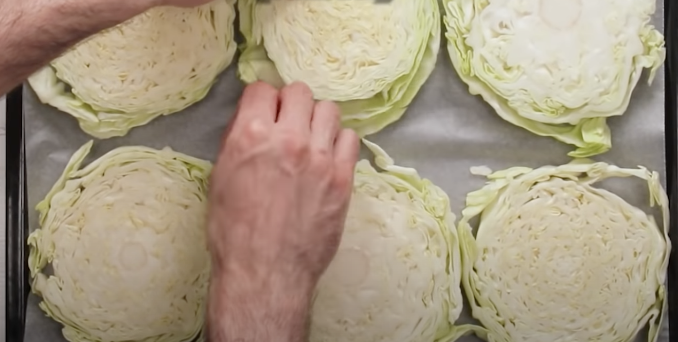 Blachę wyłożyć papierem do pieczenia i położyć na niej plastry kapusty.