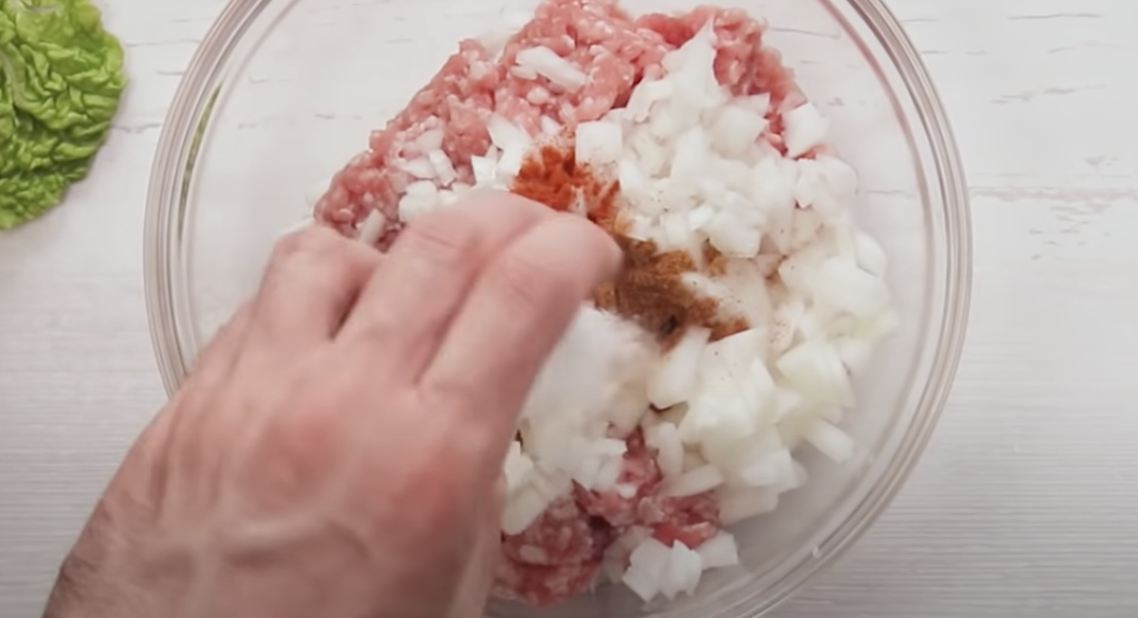 Teraz przygotujemy wszystkie składniki na farsz z mięsa mielonego. Mięso mielone wymieszać z drobno posiekaną cebulą, doprawić solą i przyprawami.