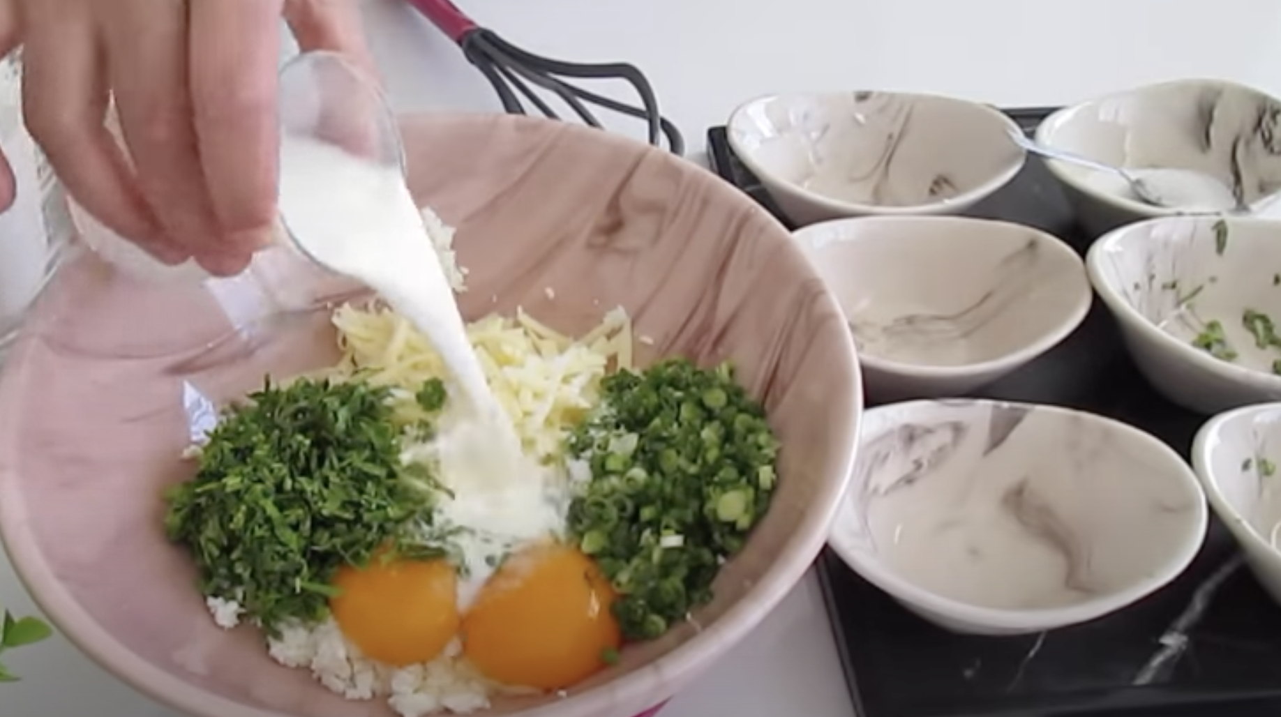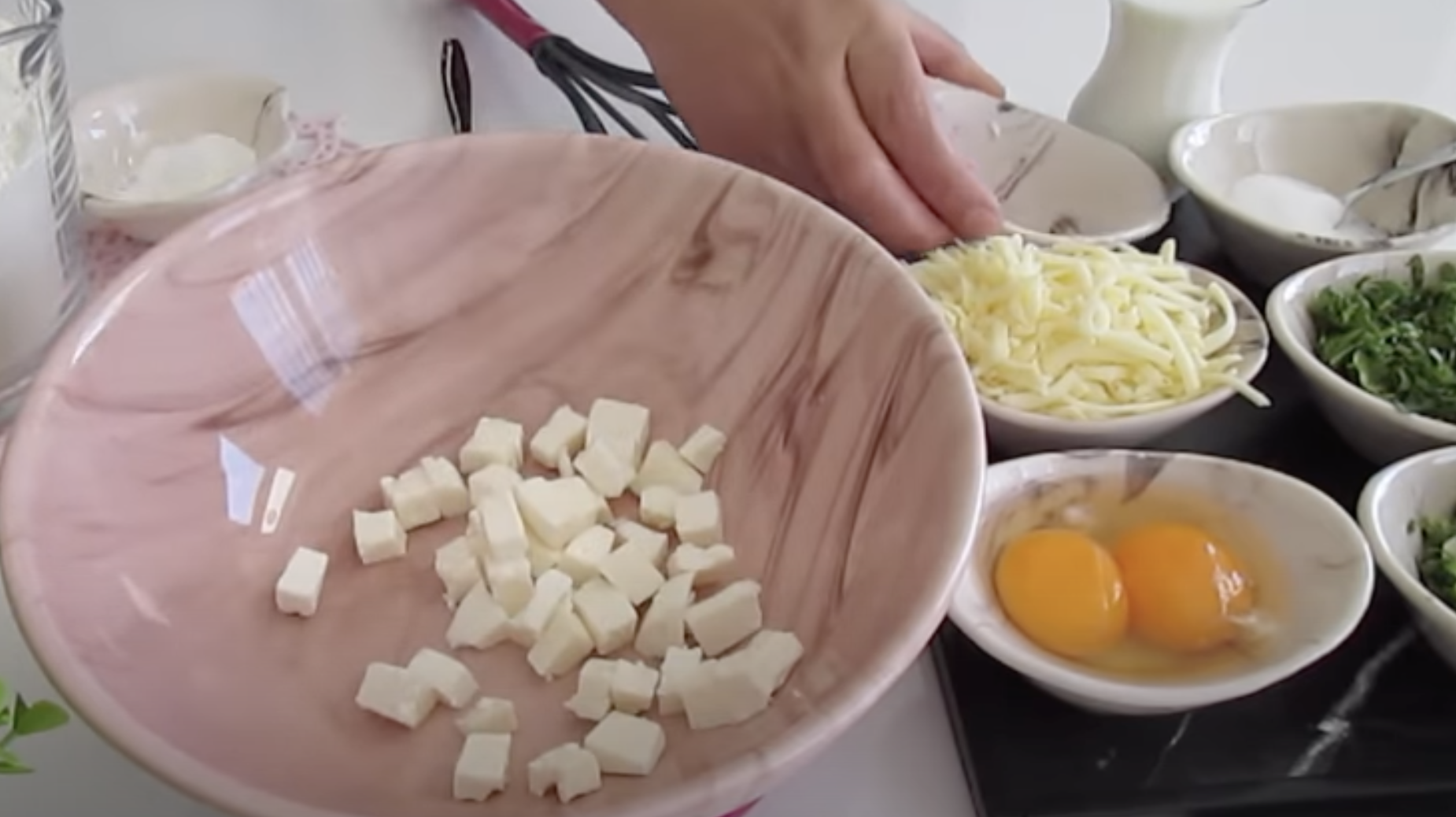Pokruszony ser bałkański, starty twardy ser, jajka, mleko oraz posiekane zioła należy wymieszać w misce. Do wymieszanych składników należy także dodać mąkę i proszek do pieczenia.