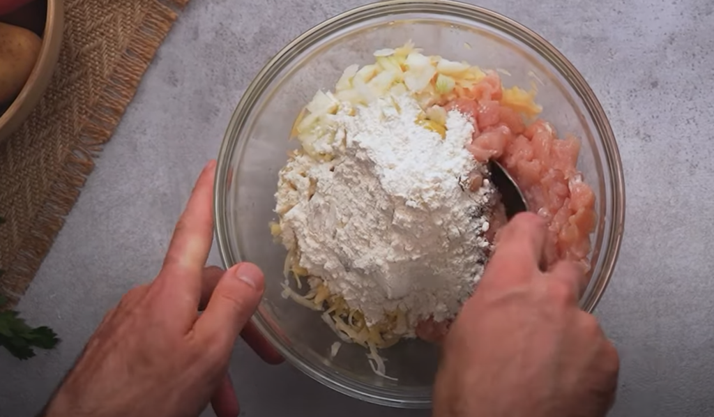 Ziemniaki myjemy i ścieramy na grubej tarce. Włóż do miski i dodaj drobno pokrojone piersi z kurczaka. Następnie dodaj drobno posiekaną cebulę, jajka, sól, mielony czarny pieprz i mąkę pszenną. Wszystko dokładnie miksujemy razem.