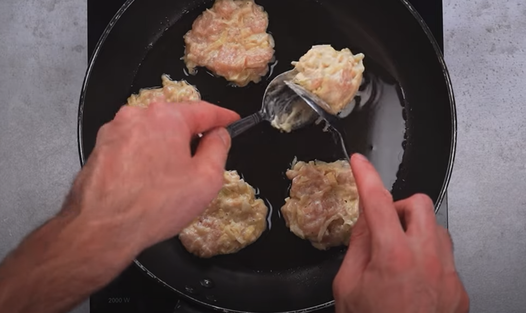 Wlej olej na patelnię, podgrzej i łyżką ułóż stosy przygotowanej masy. Uformować małe naleśniki i smażyć na złoty kolor z obu stron.