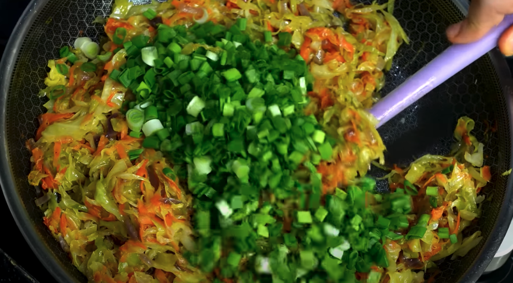 Posiekaj cebulę i smaż ją na patelni, aż stanie się przezroczysta. Zetrzyj marchewkę na tarce i dodaj do cebuli. Smaż razem przez kilka minut. Posiekaj kapustę i dodaj na patelnię. Dopraw solą i czarnym pieprzem do smaku. Smaż, aż kapusta zmięknie. Posiekaj pęczek dymki i dodaj do nadzienia. Wyjmij ziemniaki z piekarnika i równomiernie rozłóż na nich przygotowane nadzienie.