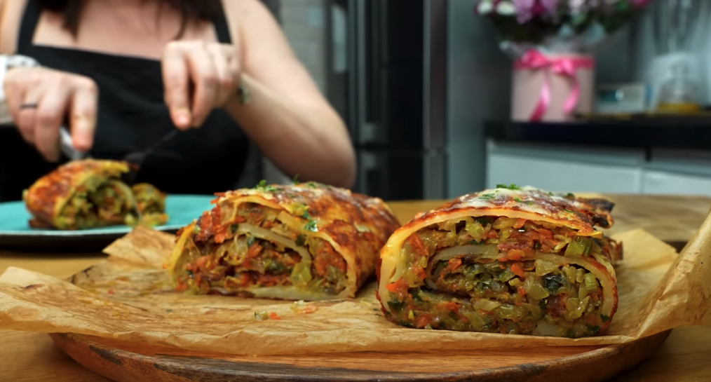 Jeśli używasz boczku, równomiernie rozłóż go na wierzchu kapusty. Posyp odrobiną sera i delikatnie zroluj ziemniaki z nadzieniem, tworząc roladę. Posyp resztą sera na wierzch rolady. Włóż z powrotem do piekarnika i piecz przez kolejne 5 minut, aż ser się roztopi i stworzy złotą, apetyczną skorupkę. Wyjmij roladę z piekarnika i odstaw na chwilę, aby trochę ostygła. Pokrój w plastry i podawaj ciepłe.