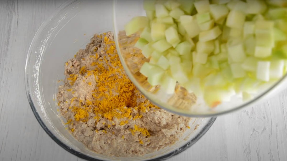 Jabłka obierz i pokrój w drobną kostkę lub zetrzyj na tarce na grubych oczkach. Do jabłek wciśnij trochę soku z cytryny. Dodaj do ciasta, Na tarce zetrzyj skórkę z cytryny i dodaj do ciasta. Wymieszaj dokładnie wszystkie składniki.