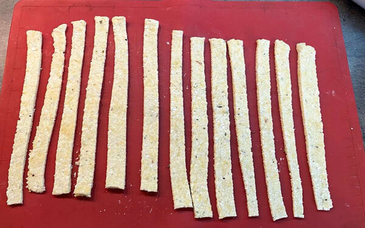 5. Po schłodzeniu ciasto należy rozwałkować i pociąć na paski. Piec w piekarniku nagrzanym do 200°C przez około 25 minut.