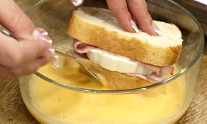 Zanurz każdą złożoną kanapkę w misce z mieszanką jajeczną i ostrożnie przewróć widelcem na drugą stronę. Poczekaj, aż ciasto całkowicie nasiąknie jajkiem i połóż je z powrotem na blasze do pieczenia. Posmaruj lub polej pozostałym jajkiem kanapki i posyp je drobno startym serem.