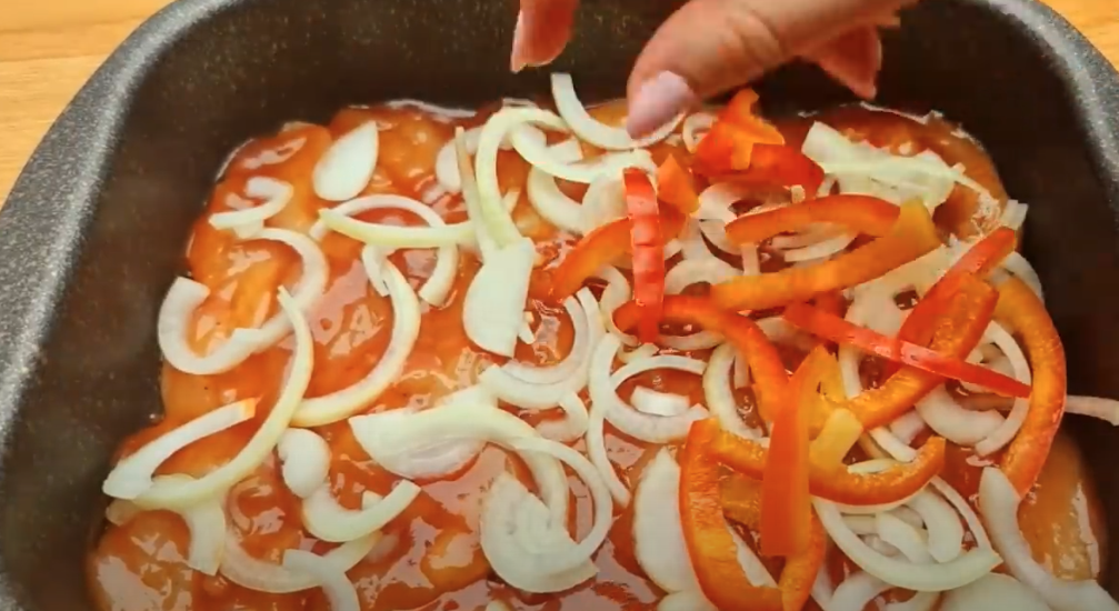 Dopraw piersi z kurczaka solą, czarnym pieprzem, papryką oraz 2 łyżkami oleju roślinnego. Odstaw na chwilę. Na patelni rozgrzej olej roślinny i podsmaż cebulę oraz paprykę, aż zmiękną. Wymieszaj sos pomidorowy z podsmażoną cebulą i papryką. W naczyniu żaroodpornym ułóż plastry ziemniaków, dopraw solą i pieprzem. Na wierzchu ułóż piersi z kurczaka, a następnie warstwę z cebulą, papryką i sosem pomidorowym.