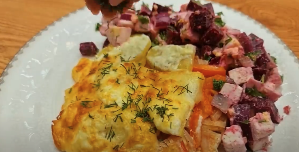 Po 30 minutach zdejmij folię i pergamin, a następnie piecz przez kolejne 10-15 minut w temperaturze 180°C, aż ser się roztopi i lekko zarumieni. Ugotowane buraki pokrój w kostkę i umieść w misce. Dodaj pokrojone jajka, fetę oraz cienkie plasterki niebieskiej cebuli.