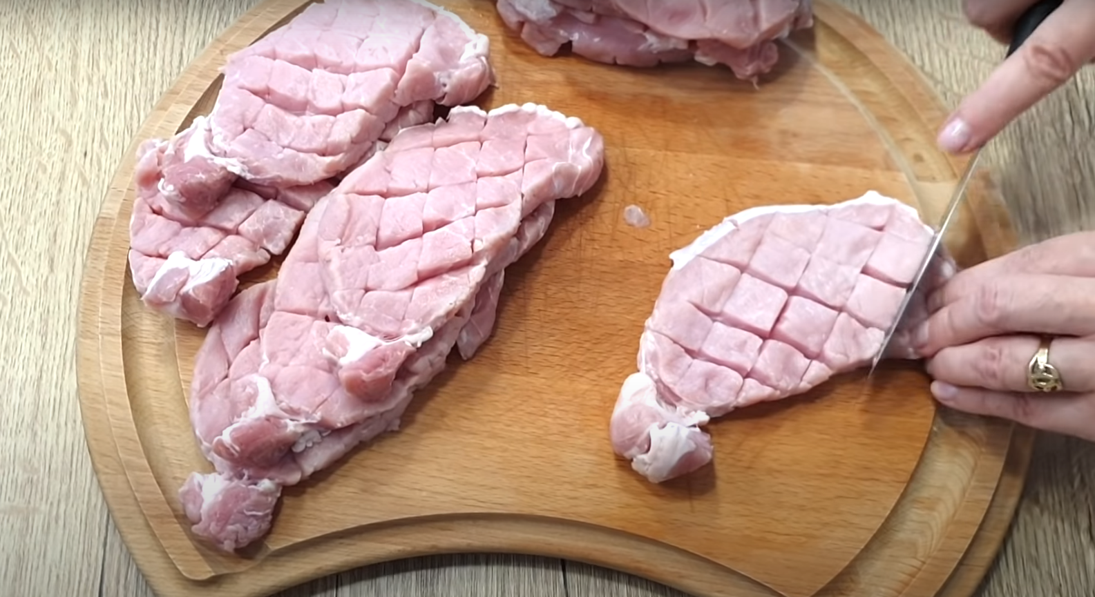 Pokrój mięso w średniej grubości plastry i ponacinaj w siateczkę z obu stron. Tak przygotowany schab posól i dopraw do smaku oraz ułóż w naczyniu wyłożonym papierem do pieczenia.