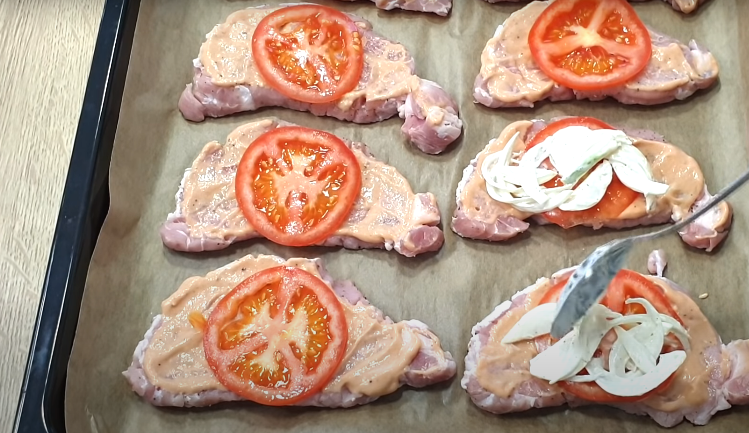 Mięso dokładnie nasmaruj sosem ketchupowo-musztardowym. Każdy kawałek udekoruj pokrojonym pomidorem oraz majonezową cebulą.