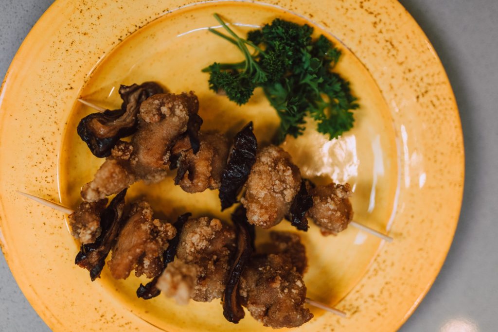 Przygotowane szaszłyki ułożyć na blasze do pieczenia. Natrzeć olejem.