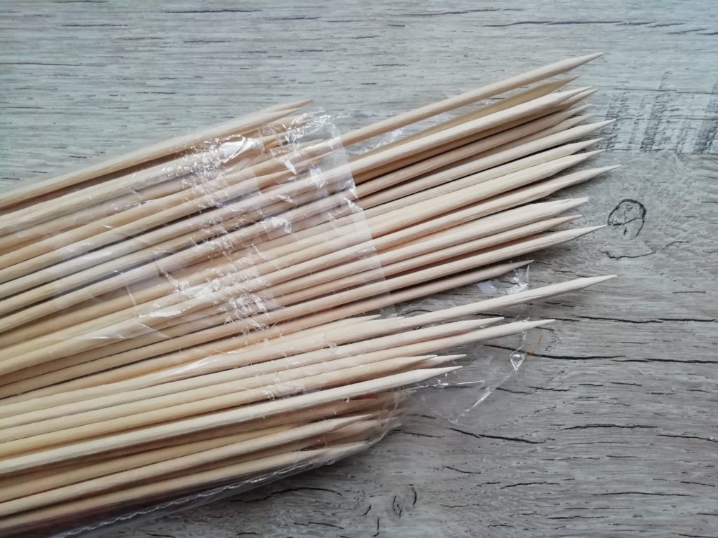 Przygotuj szaszłyki i wszystkie składniki na szaszłyki na twardej macie. Następnie nakłuwamy na przemian ziemniaki, mięso, paprykę, cebulę, boczek i ponownie ziemniaki. W ten sposób powtarzamy nakładanie warstw.