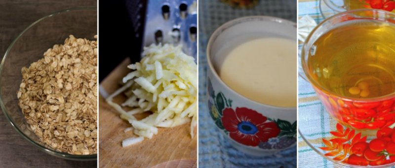 W drugim powinno znaleźć się 1 tarte jabłko bez skórki z dodatkiem 1 łyżeczki soku z cytryny i 1 łyżki płynnego miodu. W trzecim kubku mieszamy 100 ml kefiru lub jogurtu naturalnego z 1 łyżeczką soli morskiej, a w czwartym zaparzamy mocną herbatę rumiankową i czekamy, aż wystygnie.