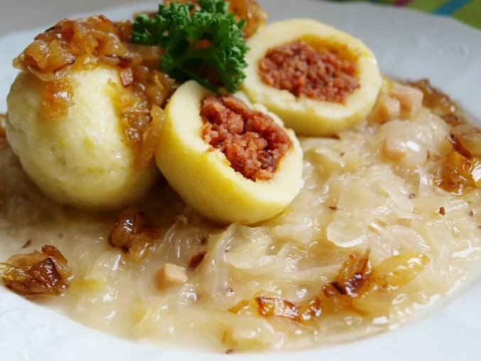 Zrobimy większe kotlety, do których dodamy pokrojone w kostkę salami na całej długości. Możemy do niego dodać także trochę wędzonego mięsa. Daje lepszy smak. Gdy ułożymy salami na pasztecie ziemniaczanym, zawijamy go w kluskę. Ugotujmy kapustę (to zależy od Ciebie, czy wolisz białą czy czerwoną). Użyliśmy domowej roboty białej kapusty. W międzyczasie zalej kluski wodą i pozwól im się zagotować. Cebulę lub resztę salami podsmażamy tak, żeby zostało trochę tłuszczu na kluski i żeby nie były suche.