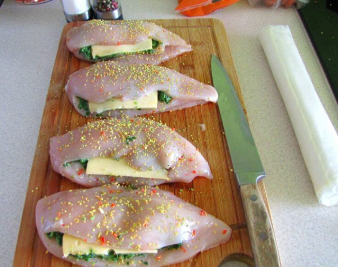 Wszystkie piesi należy naciąć tak by powstała kieszonka, którą wypełniamy przygotowanym wcześniej szpinakiem. Wierzch farszu posypujemy serem, a pierś doprawiamy solą.