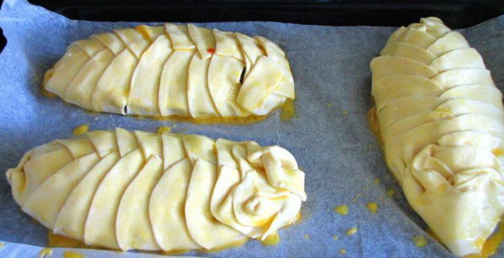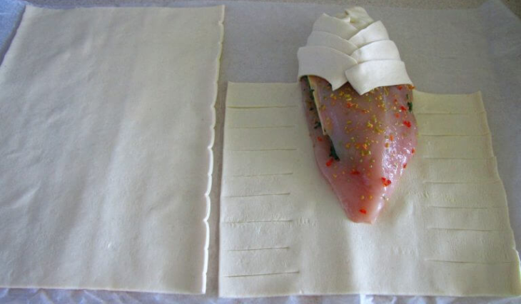 Ciasto francuskie rozwijamy na jeden płat i dzielimy go na dwie części. Następnie z obydwu stron nacinamy paski o szerokości mniej więcej 2 cm.