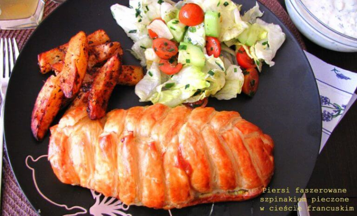 Pierś faszerowana szpinakiem, otulona ciastem francuskim z pewnością przypadnie do gustu nawet najbardziej wymagającym smakoszom. Zaserwowana w towarzystwie sałatki ze świeżych warzyw, oraz ziemniakami upieczonymi w piekarniku, będzie idealną propozycją na sobotni obiad.