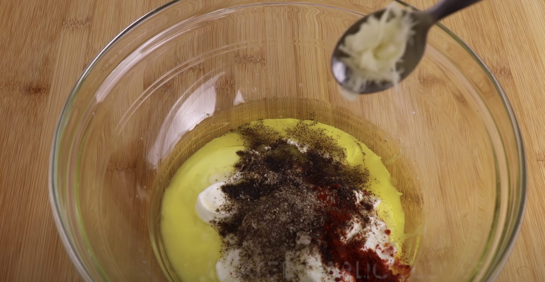 W misce wymieszaj jogurt, oliwę, przyprawy, musztardę i zmiażdżony czosnek.