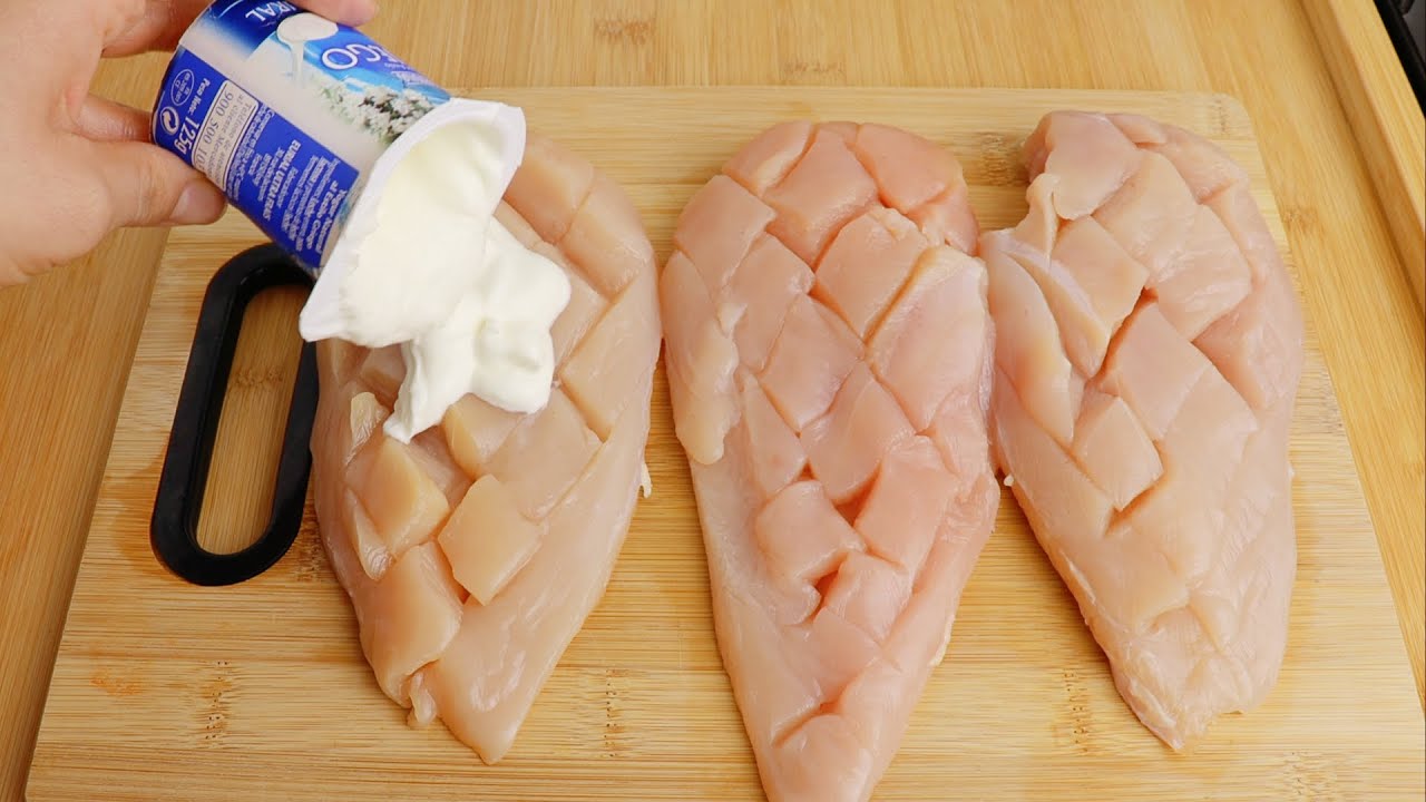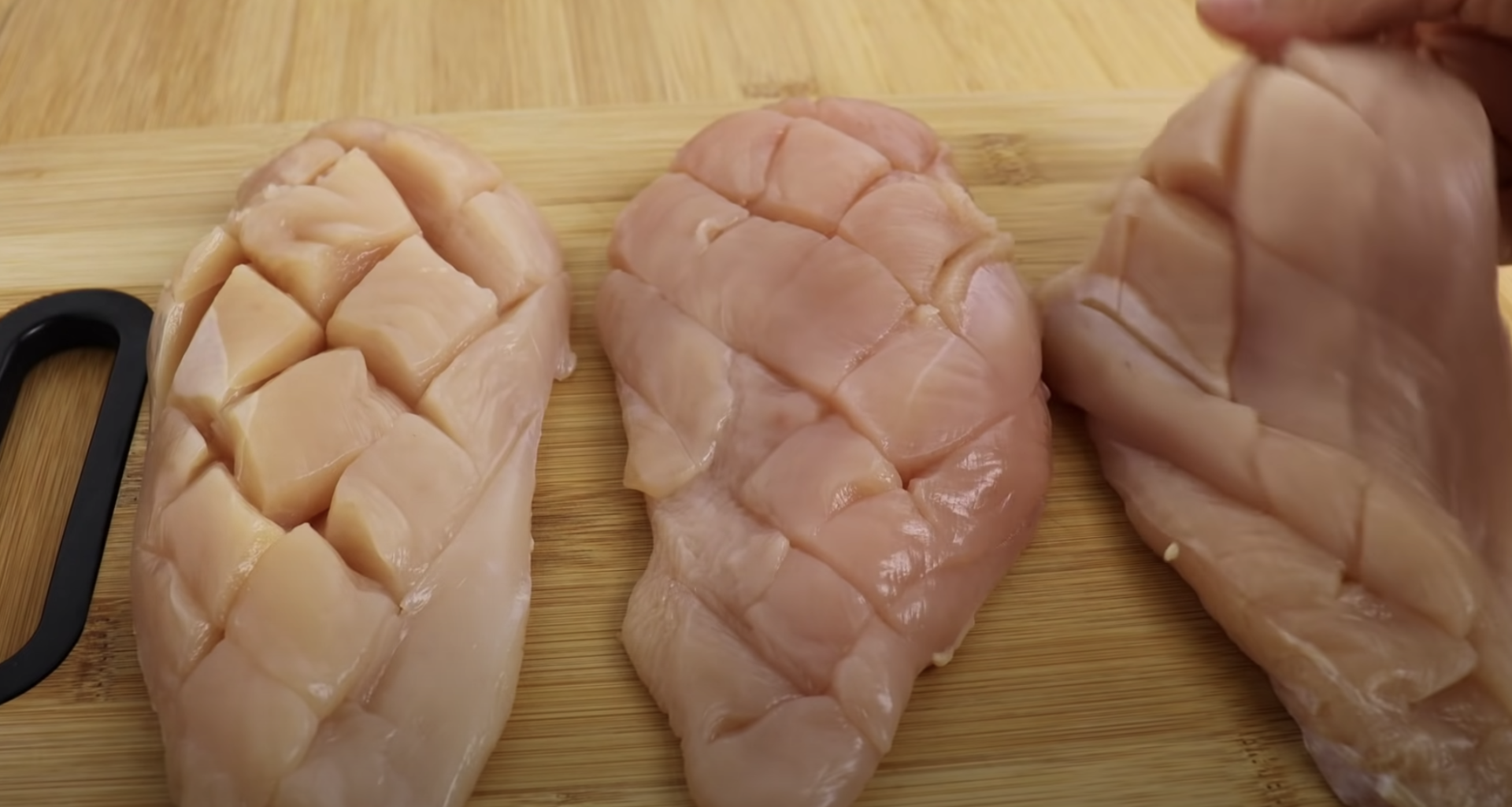 Osusz umyte piersi z kurczaka i przekrój z jednej strony tworząc na nich wzór siatki.