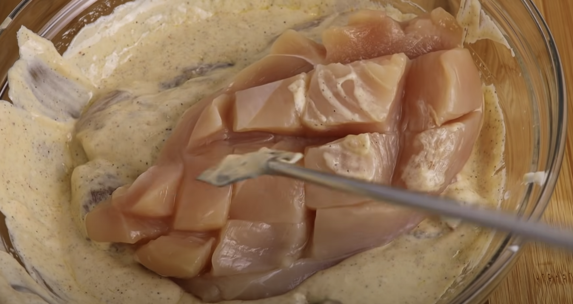 Piersi z kurczaka zanurz w przygotowanej marynacie i dokładnie obtocz tak, aby mieszanina pokryła całą powierzchnię.
