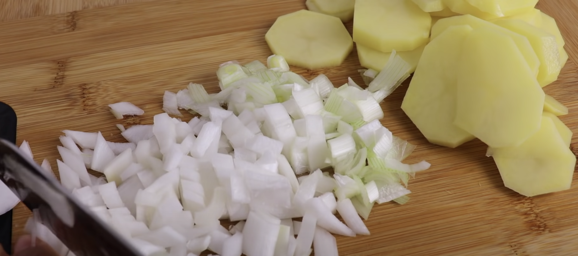 Pokrój ziemniaki na plasterki, cebulę i grzyby posiekaj.