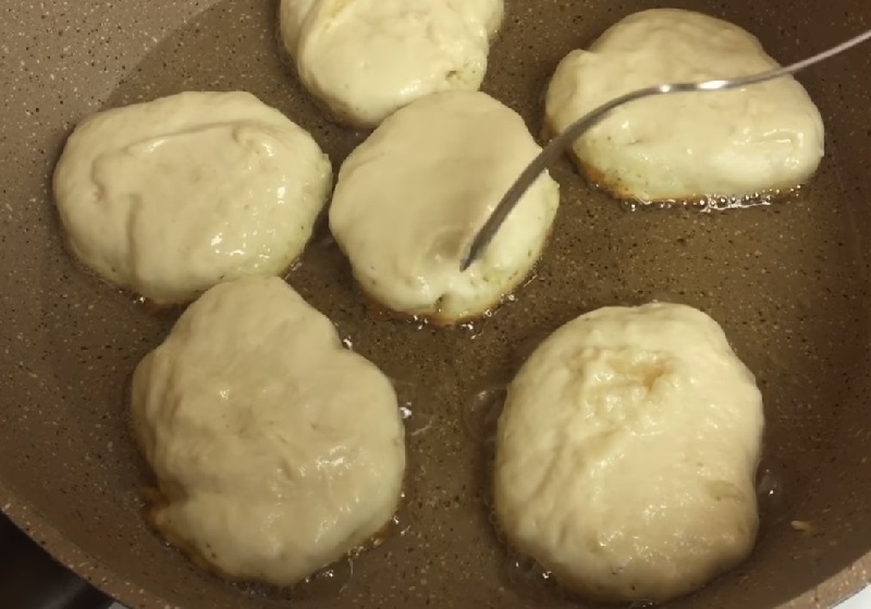 Po tym czasie czas na rozgrzanie patelni. Formując małe placuszki na patelnię nakładamy w odstępach po 1 łyżce ciasta. Całość należy usmażyć na średnim ogniu z dwóch stron na złocisto – brązowy kolor.