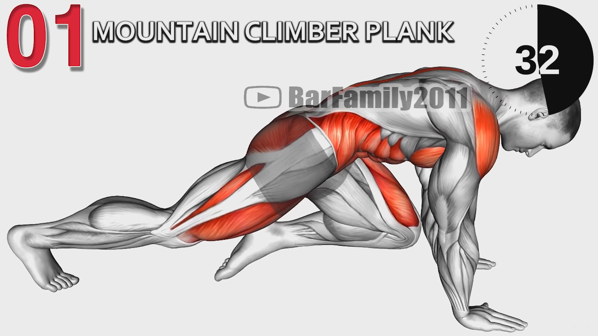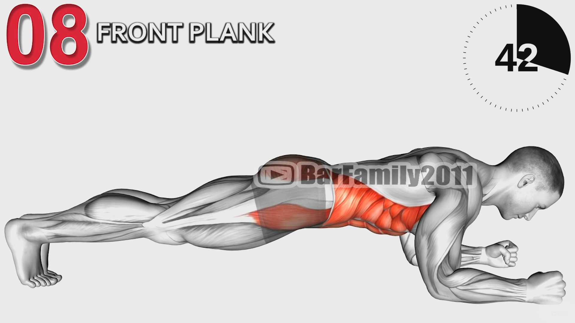 Utrzymuj pozycję deski przez 60 sekund, opierając się na łokciach, z ciałem w równej linii i wzrokiem skierowanym w dół.