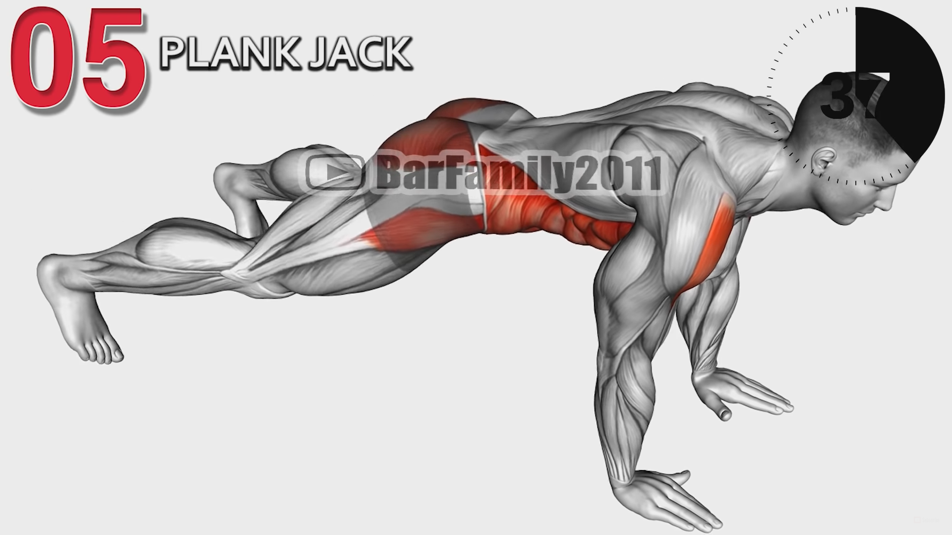 Wykonując skoki, zbliżaj i rozstawiaj nogi przez 45 sekund, pamiętając o napięciu mięśni i równomiernym oddechu.
