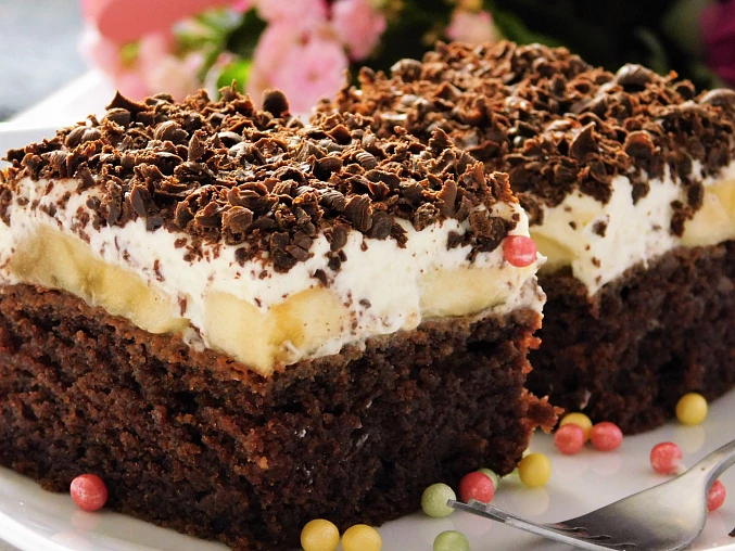 Śmietanę ubić na sztywną pianę i stopniowo dodawać mascarpone i cukier, aż powstanie gęsty i puszysty krem. Posmaruj ciasto marmoladą i ułóż banany pokrojone w 1 cm koła. Na tak przygotowane ciasto nakładamy i wygładzamy krem bananem. Całość posypujemy startą czekoladą (mleczną lub gorzką) i wstawiamy do lodówki na dwie godziny do ostygnięcia. Smacznego!