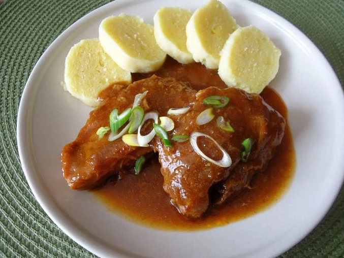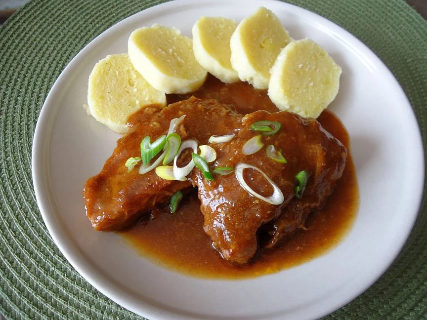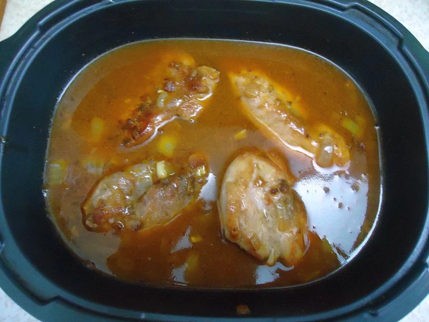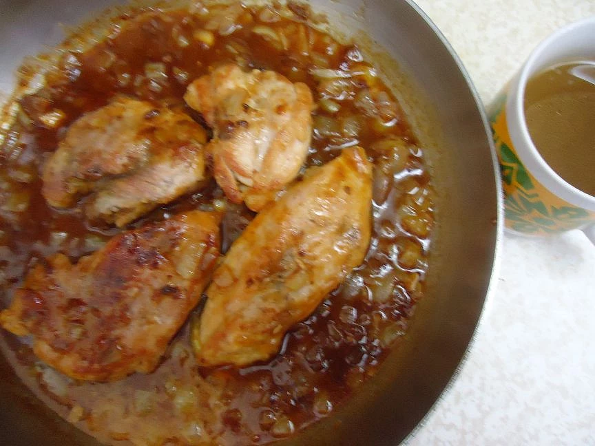 Pieczemy godzinę, po czym mięso odstawiamy na bok i sos przecedzamy przez sito, doprawiamy pieprzem i solą do smaku.
