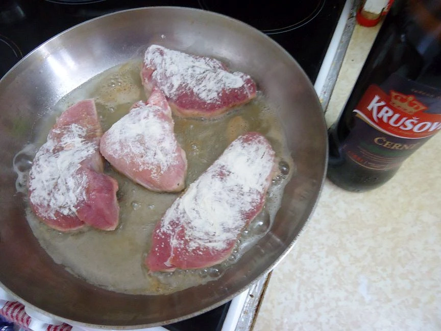 Na głębokiej patelni rozgrzać smalec, oprószyć mąką plastry mięsa i obsmażyć na smalcu z obu stron. Włączyć piekarnik na 170°C.