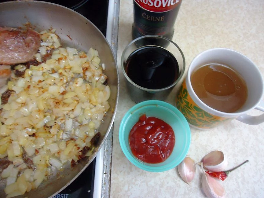 Cebulę obrać i pokroić w grubszą kostkę, mięso odłożyć na bok i podsmażyć cebulę na patelni, aż zacznie nabierać koloru. Dodać czosnek, ketchup (można kupić), pieprz do smaku, wymieszać i zalać piwem.