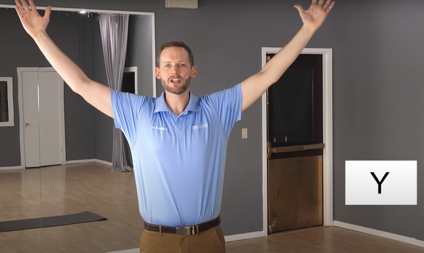 Stojąc wyprostowanym, podnieś ręce do góry ustawiając się w pozycję „Y”. Pamiętaj, by nie wyciągać ramion do góry, a głowę utrzymywać w równym pionie z plecami jak w poprzednich ćwiczeniach. Kolejnym krokiem jest wyciągnięcie dłoni w tył aż do momentu, gdy poczujesz przyjemne rozciąganie ramion oraz klatki piersiowej. Utrzymuj pozycję wykonując dwukrotnie głęboki wdech i wydech.