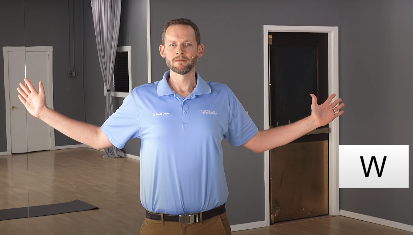 Następnie przeciągaj ręce w dół tak by przejść do pozycji „W” z poprzedniego ćwiczenia, ponownie wykonując dwukrotnie głęboki wdech i wydech.