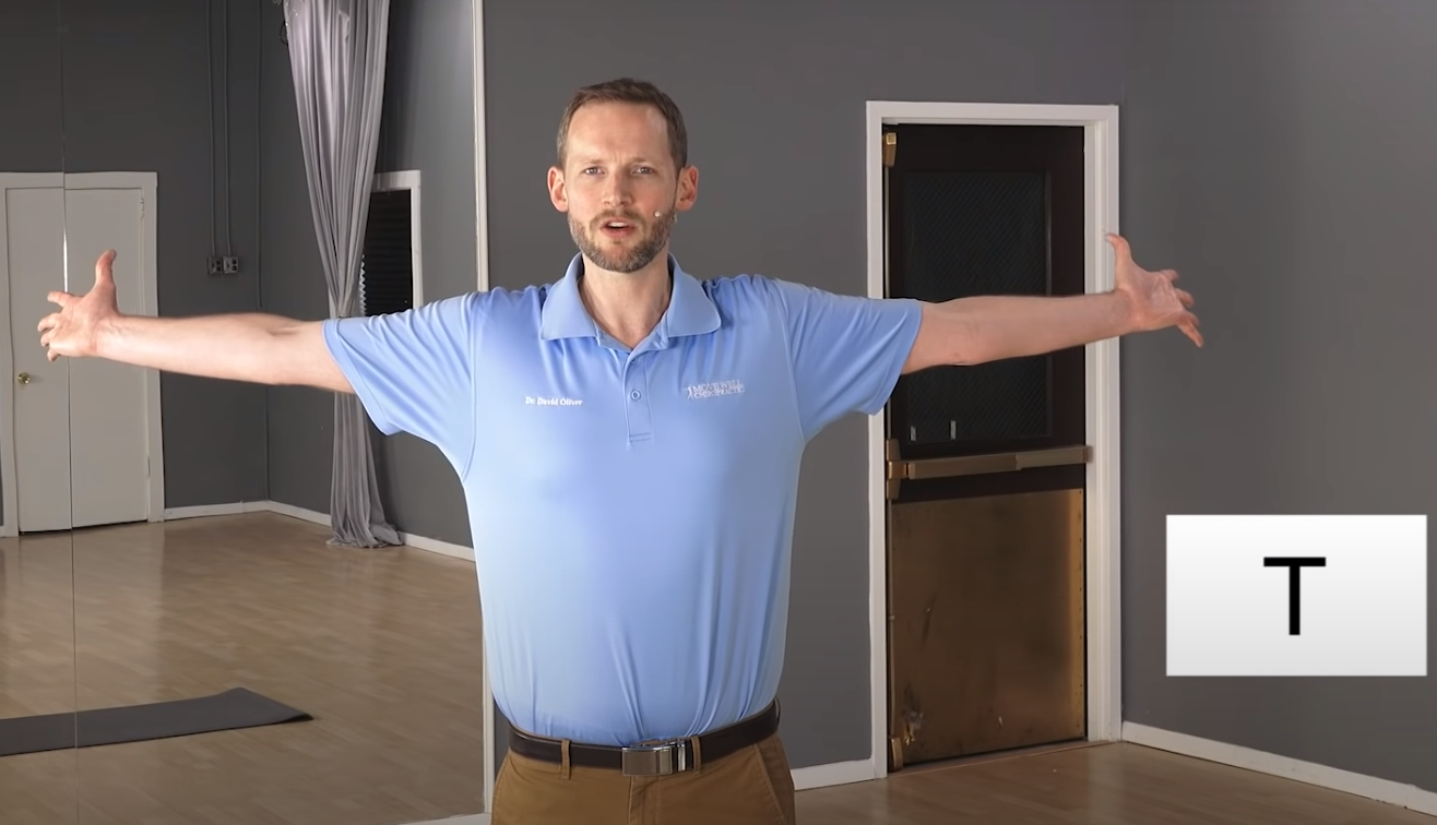 W ostatnim kroku ułóż ramiona w pozycji „T”, czyli tak by ręce znajdowały się z ramionami w linii prostej na poziomie ramion, z dłońmi skierowanymi do przodu. W takiej pozycji odchylaj ręce w tył, aż nie poczujesz napięcia w klatce piersiowej. Utrzymaj tak przez 2 głębokie wdechy i wydechy.